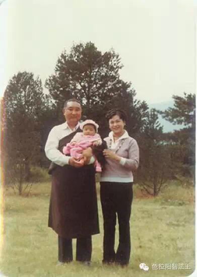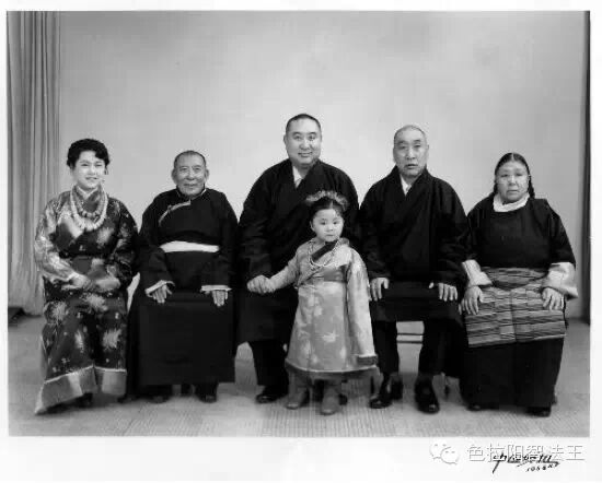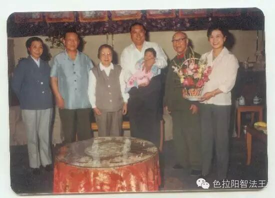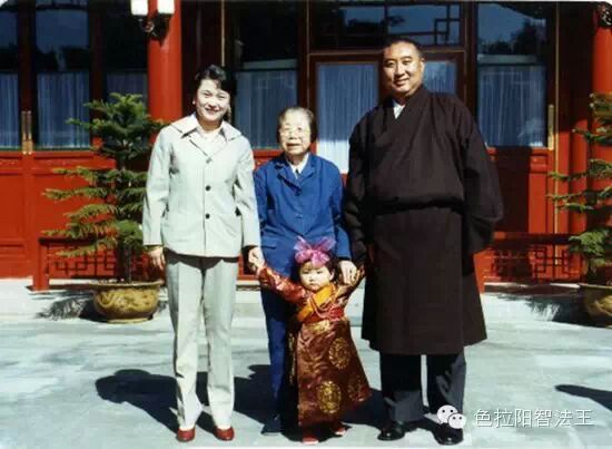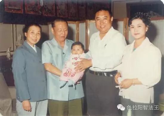 班禅与李洁的女儿叫仁吉旺姆,班禅去世的时候,她才五岁半。小学毕业后,李洁将仁吉旺姆送到美国上学。此后,仁吉旺姆一直在美国求学。图为女儿四岁生日时班禅夫妇与父母以及经师嘉雅活佛合影。